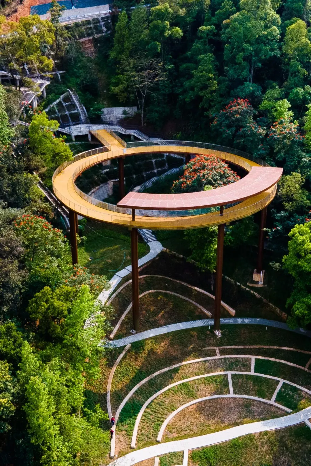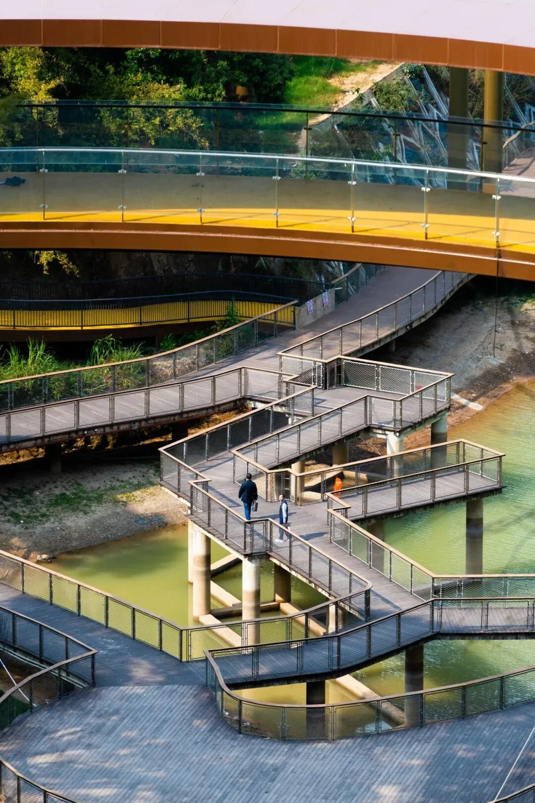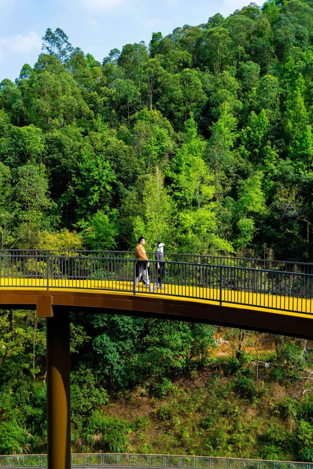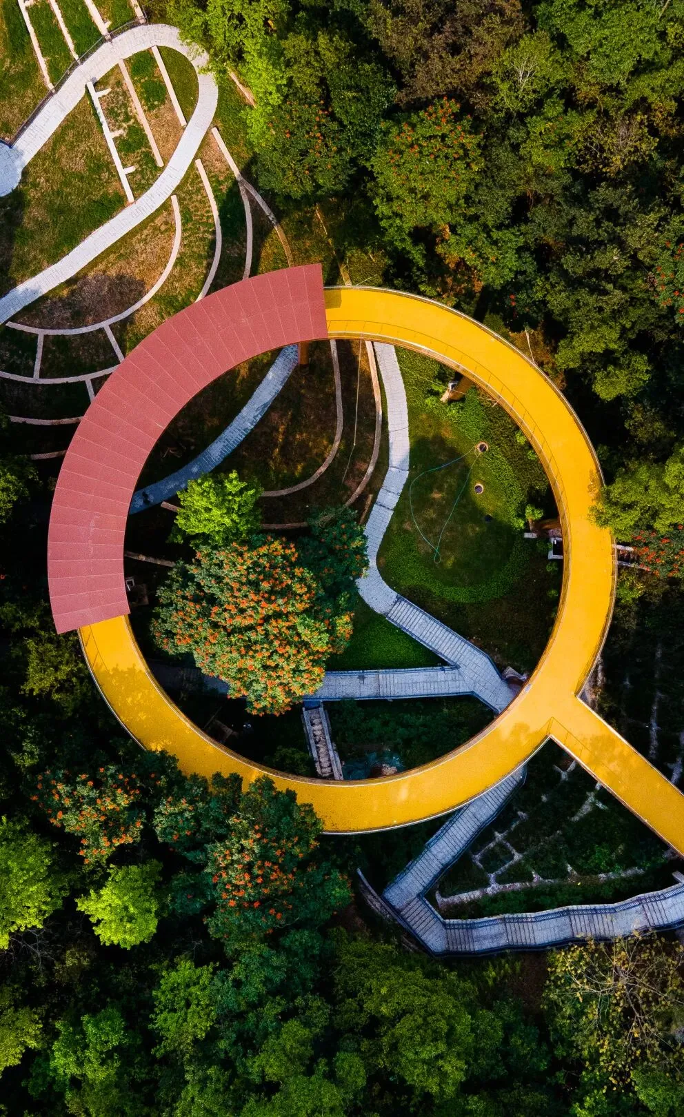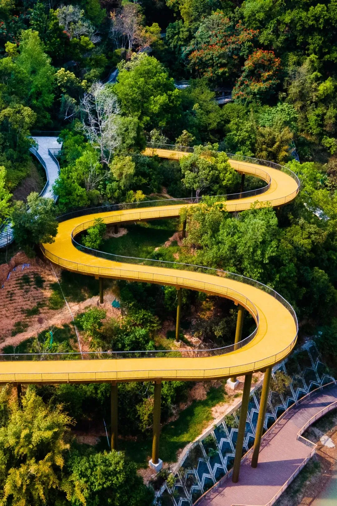 公园里最引人注目的,莫过于这条明黄色的架空环桥,一个巨大的圆环温柔地架在山谷间,仿佛和密林融为一体。