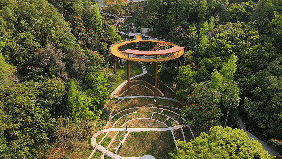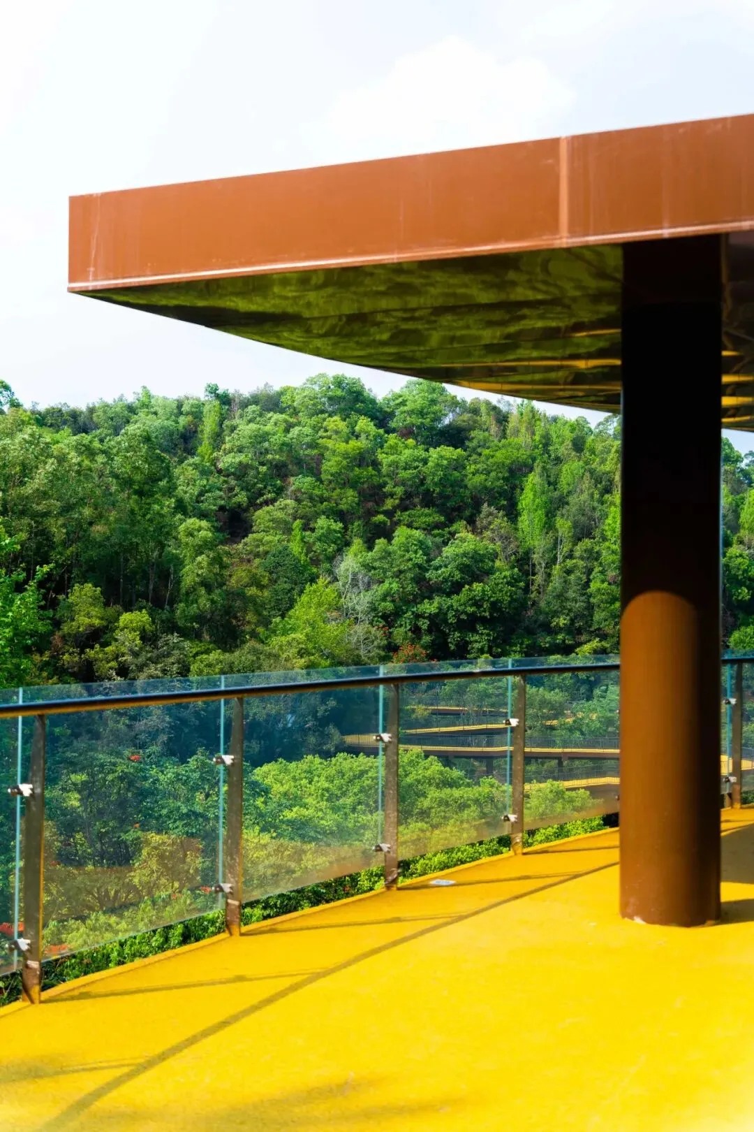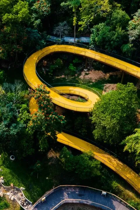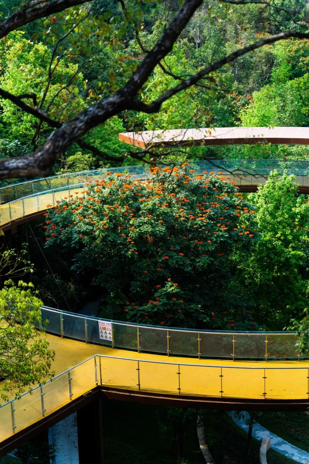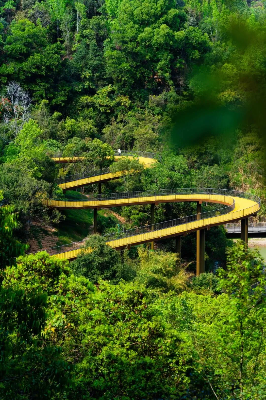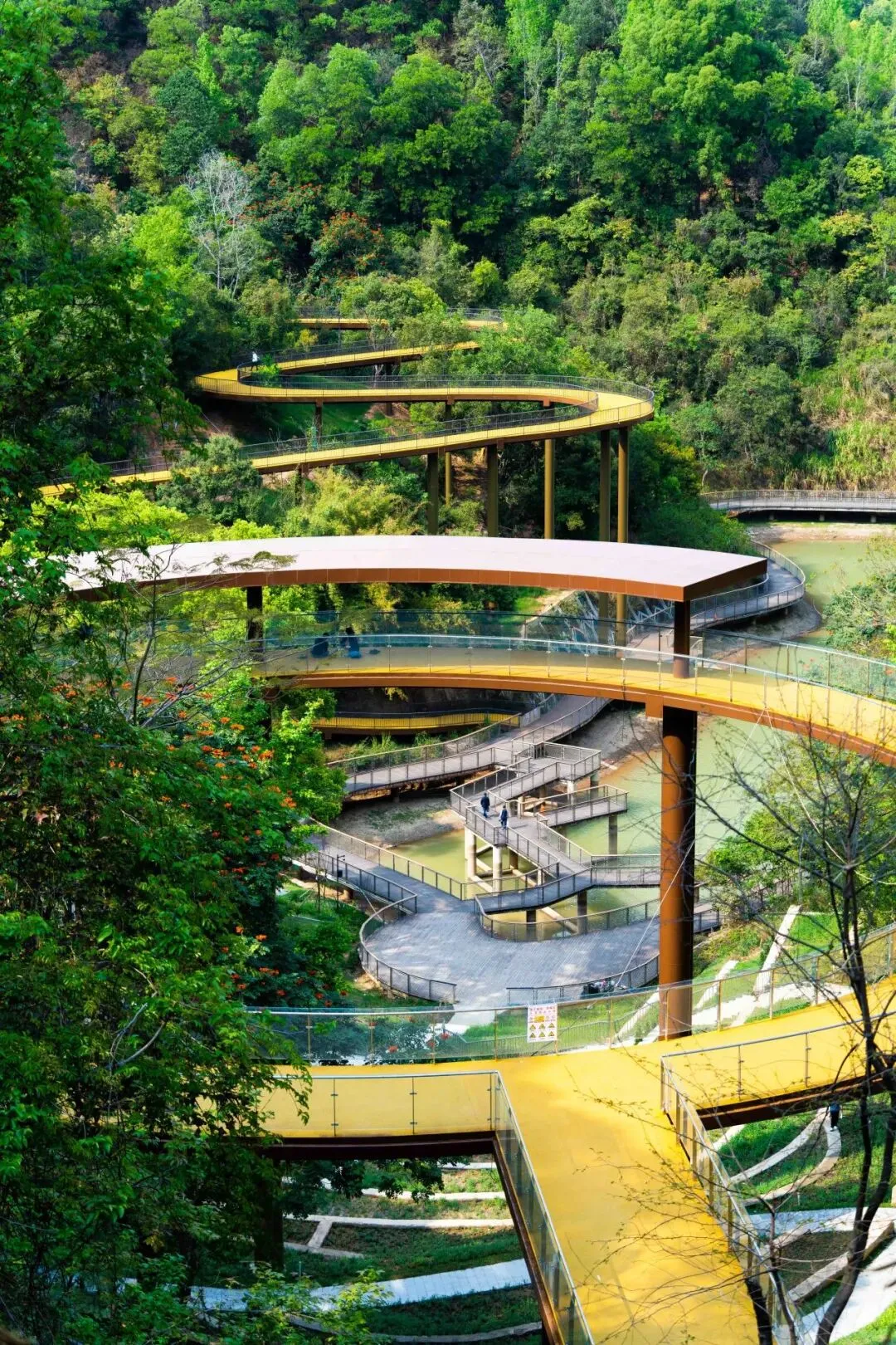 公园里最引人注目的,莫过于这条明黄色的架空环桥,一个巨大的圆环温柔地架在山谷间,仿佛和密林融为一体。