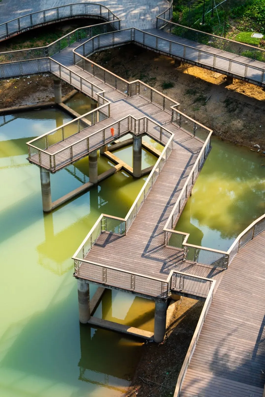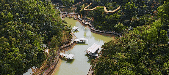 行走在高空桥面上,视野逐渐开阔起来,将湖光山色尽收眼底——脚下是层叠的树冠,远处是静谧的湖面,再往远,是绵延的山脊线。