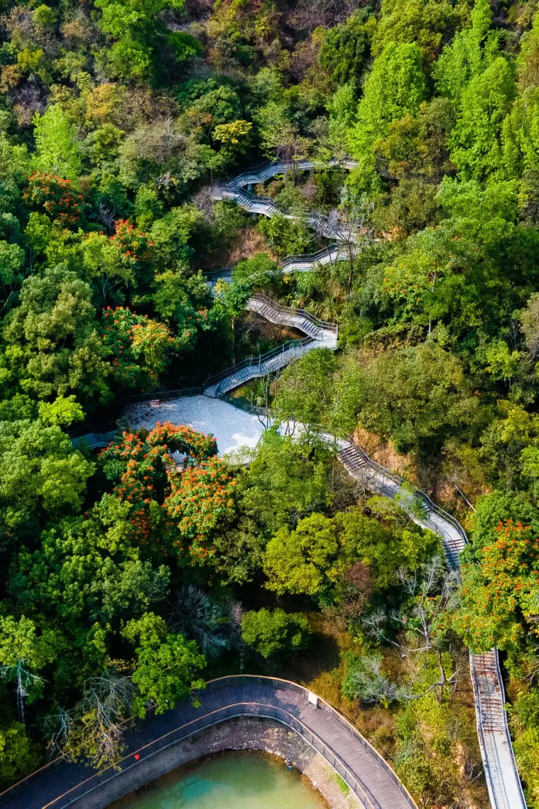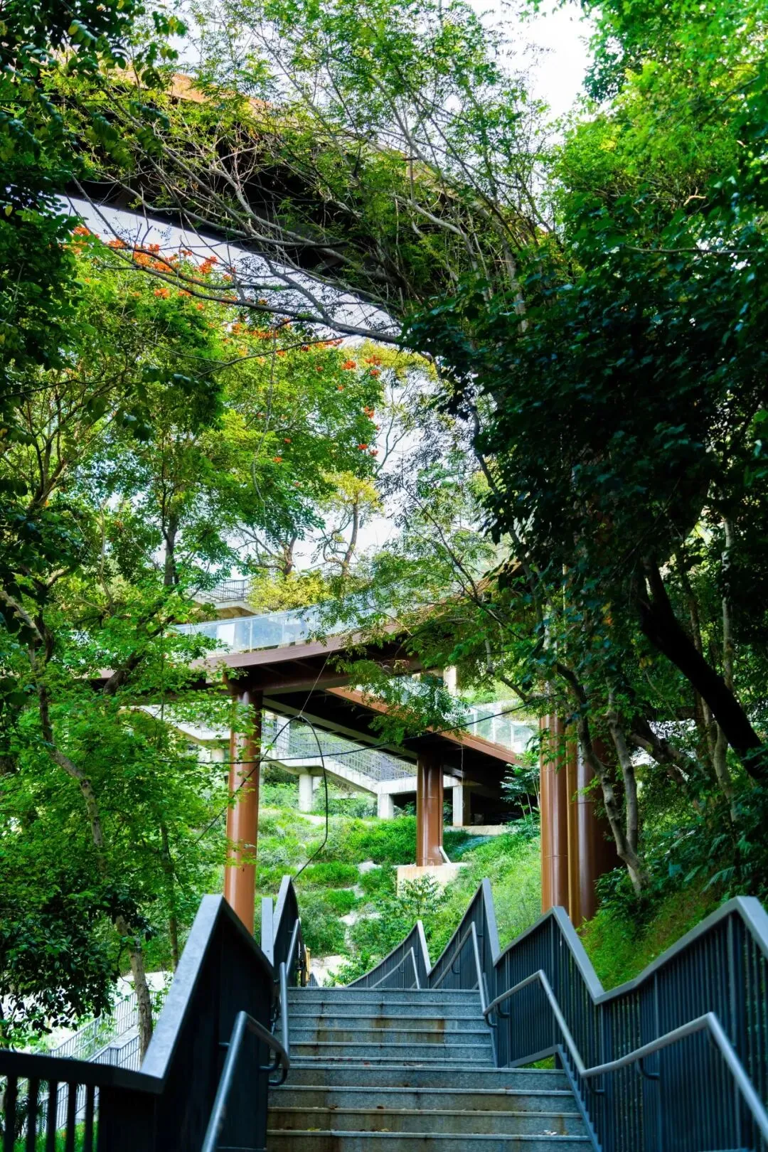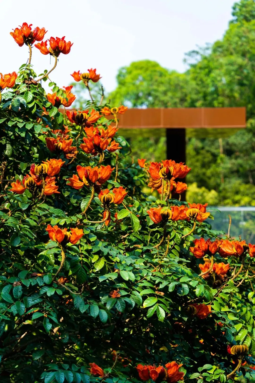 圆环里还有一株正在盛放的火焰花树,热烈的红与层叠的绿形成极致对比,置身其中,仿佛忘掉城市喧嚣,感到一种难得的自由。