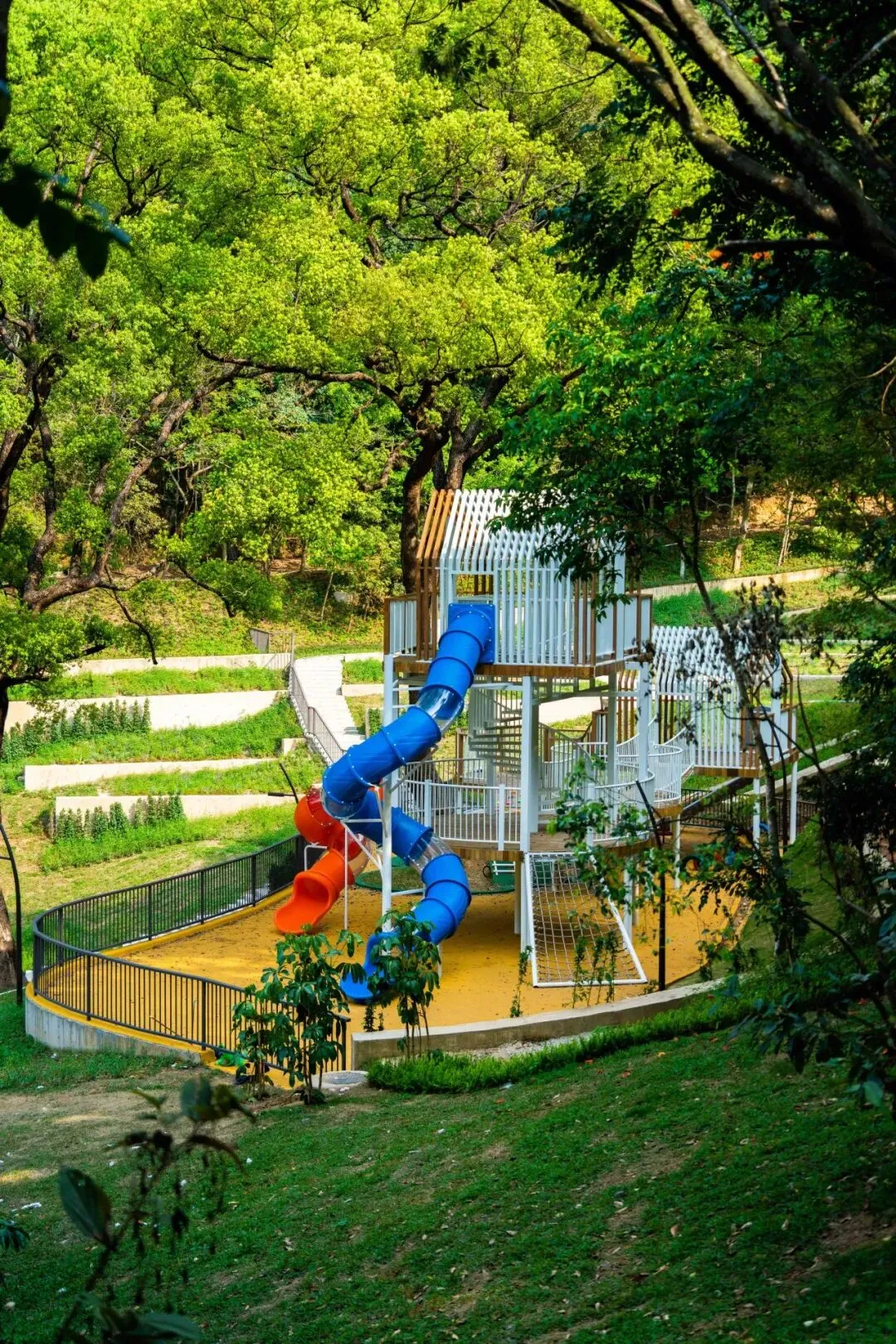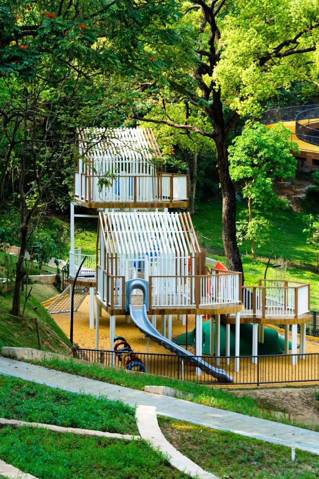 沙池、秋千、大型滑滑梯、攀爬网等多个项目一应俱全,孩子们可尽情释放压力,浓密的树荫遮挡,不用担心暴晒,玩累了就在旁边的休憩区歇脚。
