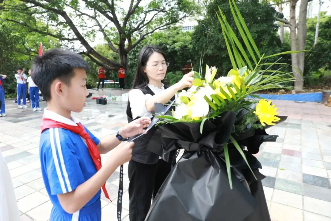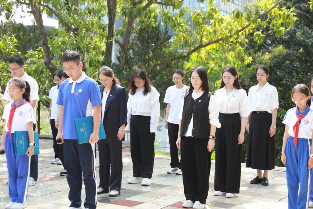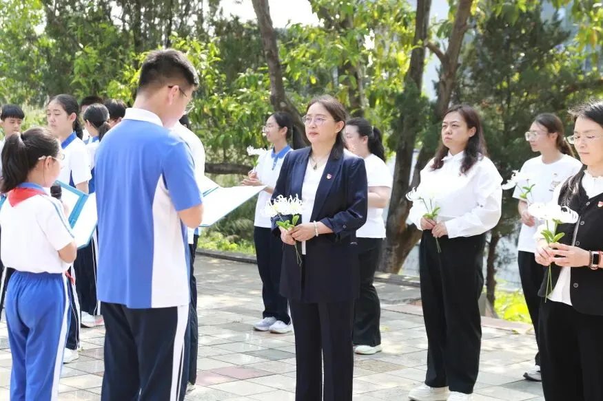 清扫完毕,庄严的祭扫仪式开启。国歌奏响,全体肃立,齐唱国歌。礼毕,党员、团员、队员代表敬献花篮,党总支明秀琴书记上前整理缎带。随后,全场默哀三分钟。这一刻,时间仿佛静止,历史与现实交汇,一堂跨越时空的“历史课”悄然生成:先烈以生命许下“黎明”,后辈以铭记回应“看见”。