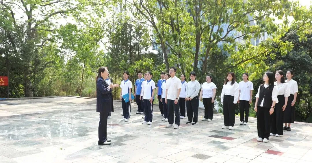 默哀结束,明秀琴书记的思政课将祭扫活动推向思想深处。没有讲台,没有PPT,身后是巍峨的纪念碑,眼前是凝神聆听的师生。“请大家抬头看看这块碑。” 明秀琴书记首先将大马山革命烈士纪念碑的由来娓娓道来,讲述了革命先辈浴血奋战的峥嵘岁月,引导同学们在历史坐标中读懂“牺牲”。“我们不是生在和平的年代,只是生在和平的中国。” 话锋一转,结合当下复杂的国际局势,点出“岁月静好”背后的沉重代价——那是先辈用舍生取义换来的。“缅怀最好的方式,不是泪水,而是行动。”明秀琴书记勉励全体学生,把对先烈的缅怀转化为刻苦学习的动力,把先烈的爱国信念,接过来、传下去,立志成长为担当民族复兴大任的时代新人。这堂没有围墙的思政课,字字千钧。