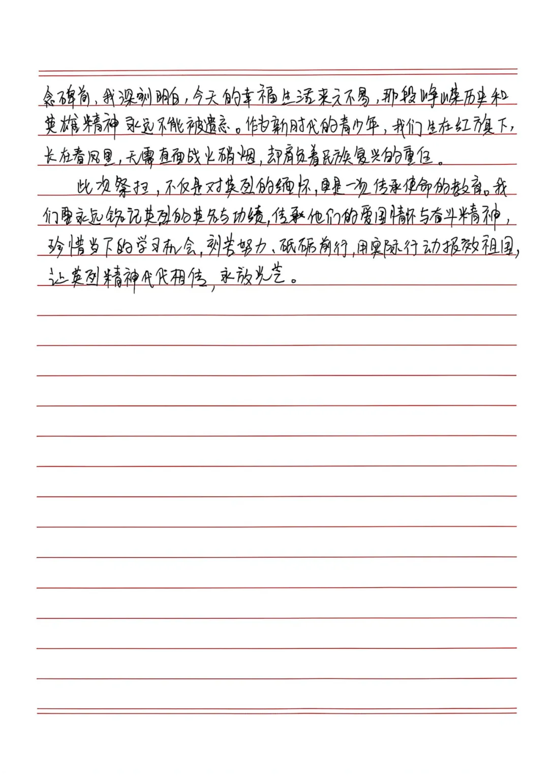 明秀琴书记的思政课在师生心中激起强烈共鸣。共青团员杨青青作为代表发言,誓言要以先烈为榜样,锤炼本领,勇担青春使命,以实际行动向党靠拢。少先队大队长肖迪畅带领在场少先队员重温入队誓词。“准备着,为共产主义事业而奋斗”的铿锵誓言,正是对书记思政课最响亮的回应,也是对革命先烈最郑重的承诺——这盛世,如您所愿;这薪火,我来相传。