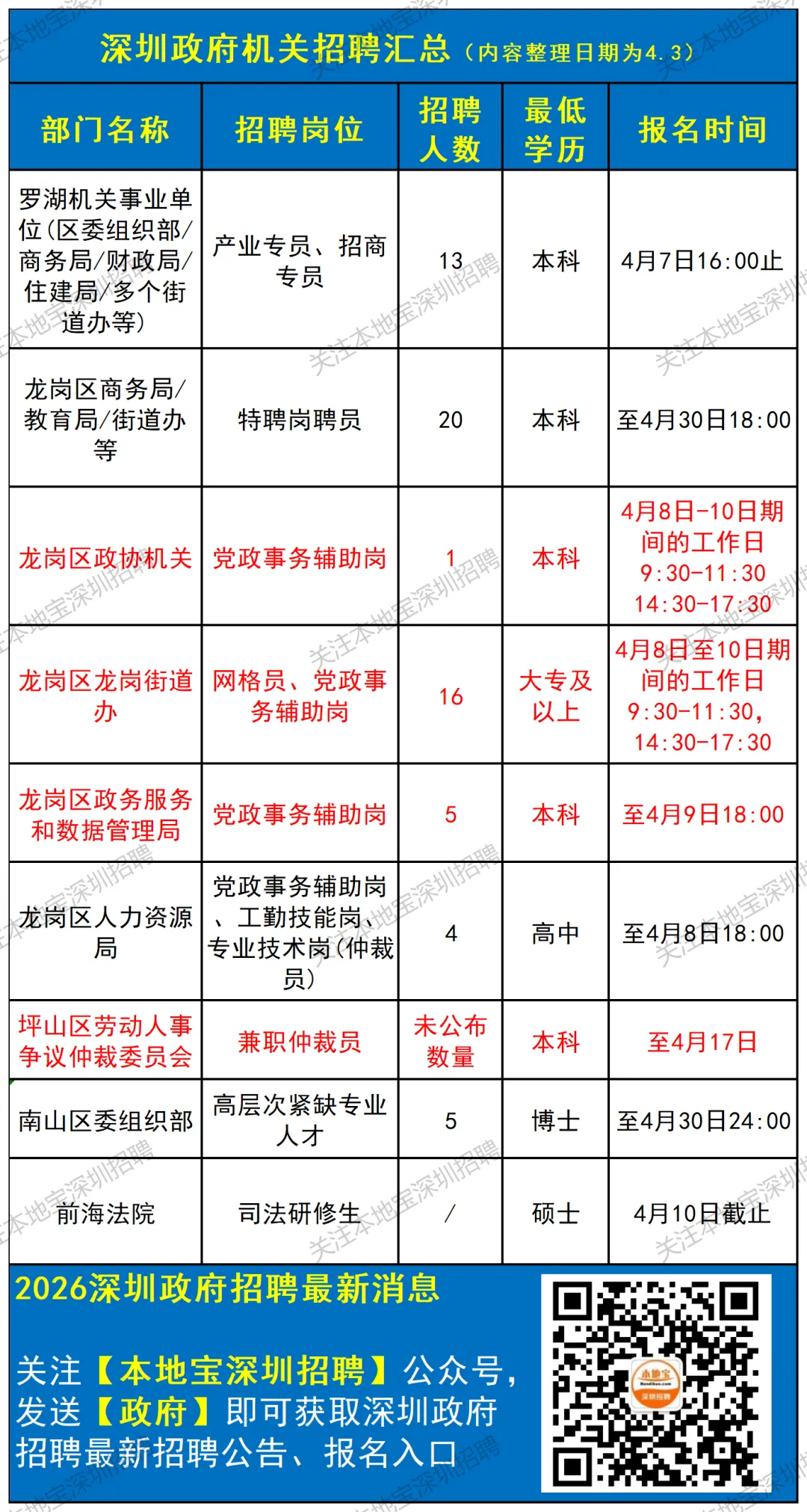 ⭐推荐服务:扫描下方二维码,关注【本地宝深圳招聘】公众号,发私信【街道办】即可获取龙岗区龙岗街道办招聘公告全文、下载所需材料下载、查看咨询电话+拟聘人员名单查询入口;还可以持续获取深圳近期其他街道办招聘信息
