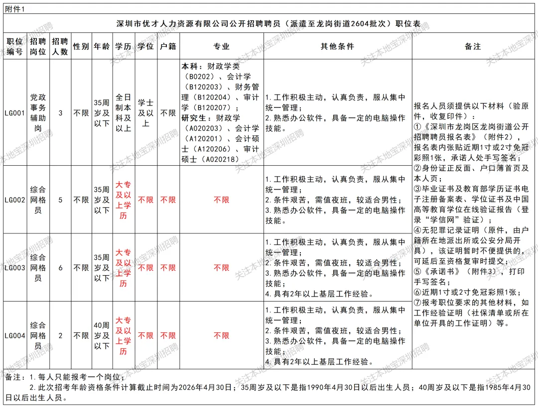 招聘党政事务辅助岗、网格员,一共16人,大专有岗,具体要求如下图所示