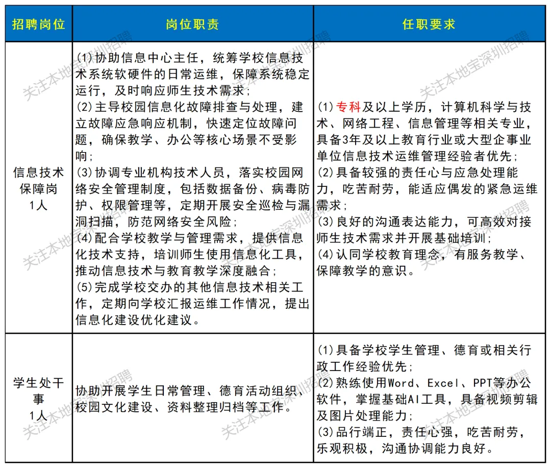 招聘信息技术保障岗(1人)、学生处干事 (1人),具体要求如下图所示