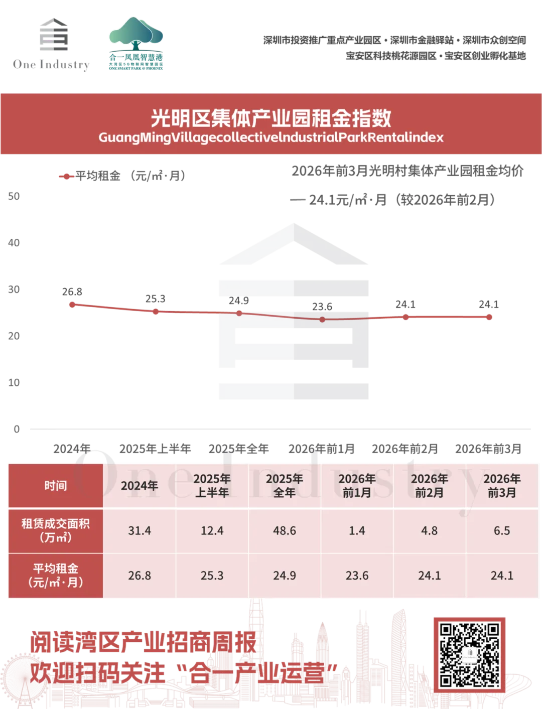 2026年前3月,深圳光明区共6宗集体产业园厂房等产业用房租赁成交,合计租赁成交建面约6.5万㎡,平均月租金为24.1元/㎡。