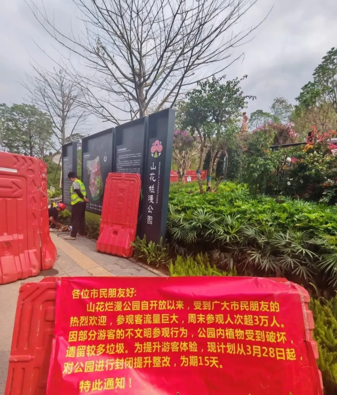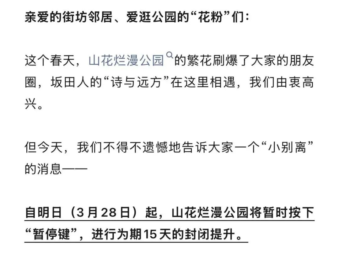随后,记者又致电了龙岗区文化广电旅游体育局,该局接线人员证实公园确实是在闭园整改中,预计4月中旬重新开放,大概15天左右。对于山花烂漫公园目前的整改进度,该人员表示并不清楚。