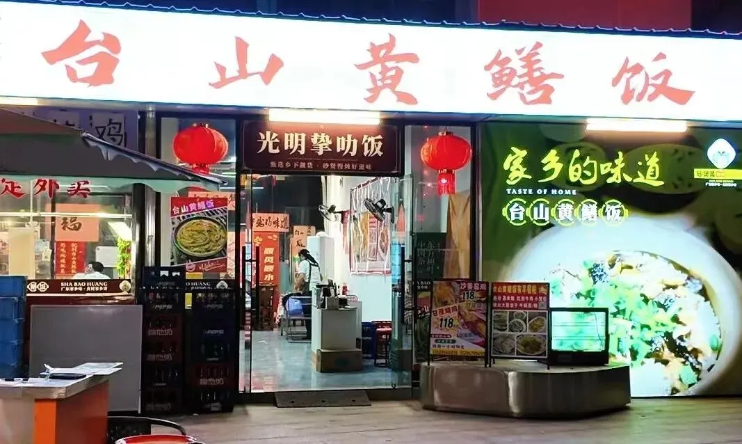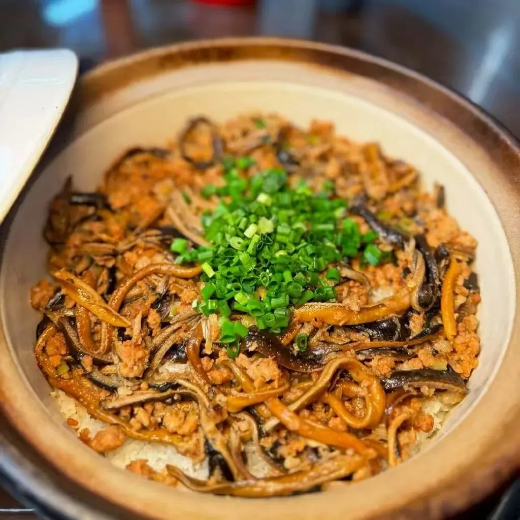 店里招牌台山黄鳝饭,黄鳝每日从台山新鲜运到,现点现做。揭开沙煲盖,热气裹挟着香气扑面而来。黄鳝肉嫩滑,米饭粒粒分明,吸饱了肉蓉、葱花和秘制酱汁的精华,锅底还有金黄焦脆的锅巴,一口下去,满足感爆棚。