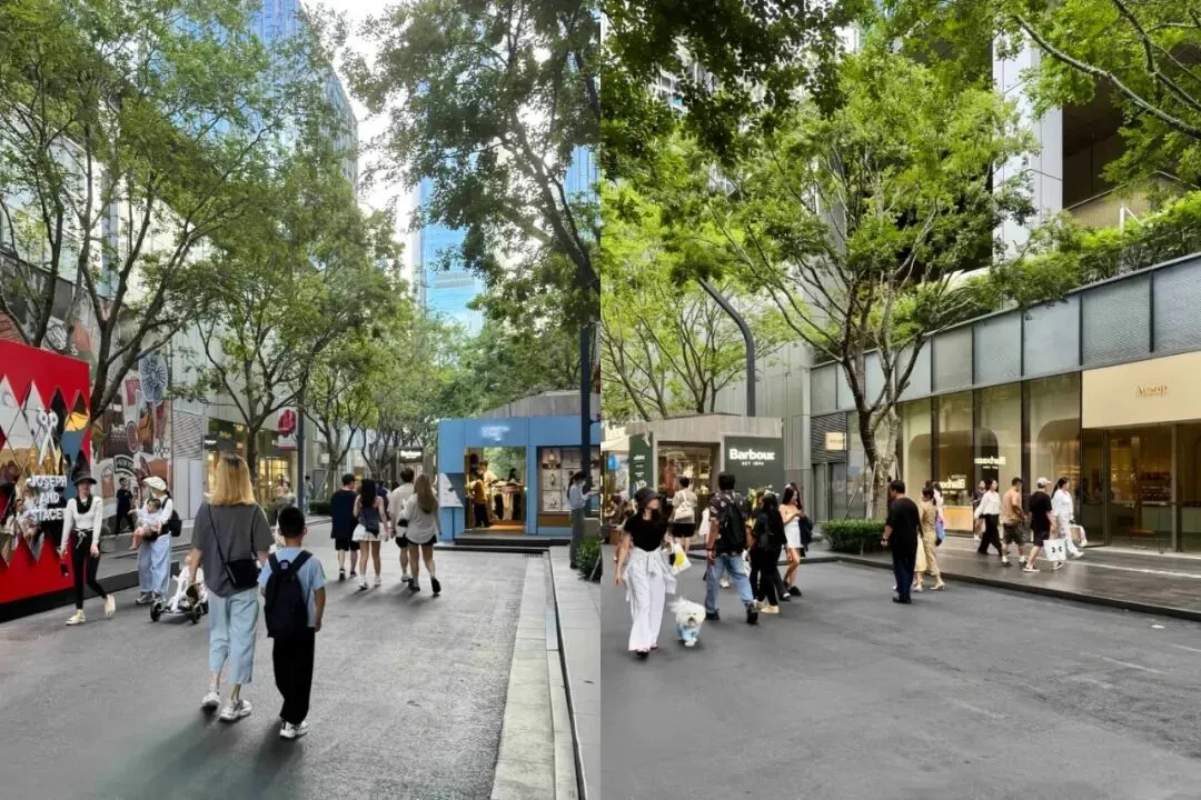 街区内部大量采用“树阵+步行街巷”的布局(如右侧图的林荫道),高大的乔木形成天然遮阴,地面铺装模拟“石板路”质感,配合两侧的低矮商铺与户外餐饮区,复刻了“城市老街巷”的松弛氛围。这种“自然+市井”的混合场景,让顾客在购物之余,自然产生“坐下来喝杯咖啡”“在树下闲聊”的行为,停留时间从“购物时长”延伸到“生活时长”。