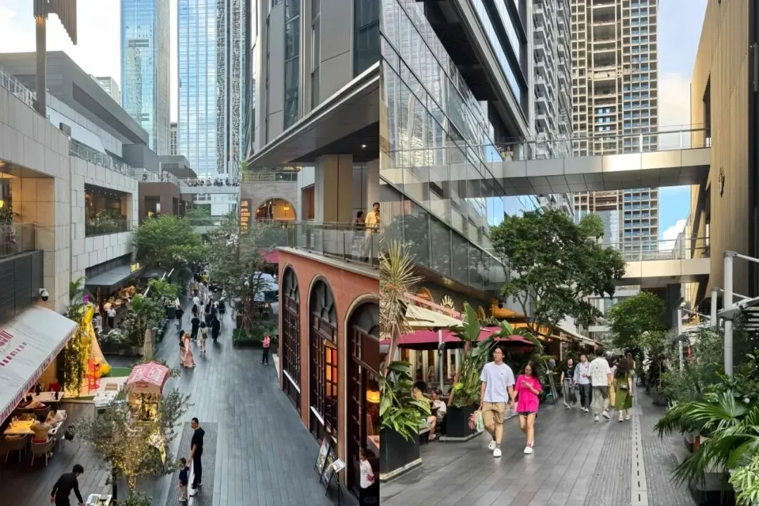 街区内部大量采用“树阵+步行街巷”的布局(如右侧图的林荫道),高大的乔木形成天然遮阴,地面铺装模拟“石板路”质感,配合两侧的低矮商铺与户外餐饮区,复刻了“城市老街巷”的松弛氛围。这种“自然+市井”的混合场景,让顾客在购物之余,自然产生“坐下来喝杯咖啡”“在树下闲聊”的行为,停留时间从“购物时长”延伸到“生活时长”。