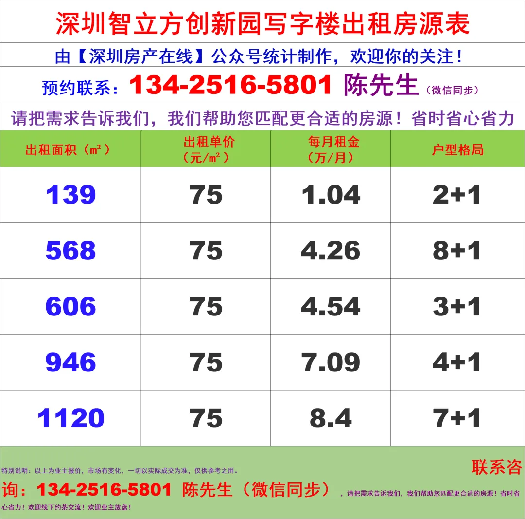 深圳智立方创新园写字楼办公室租金价格表