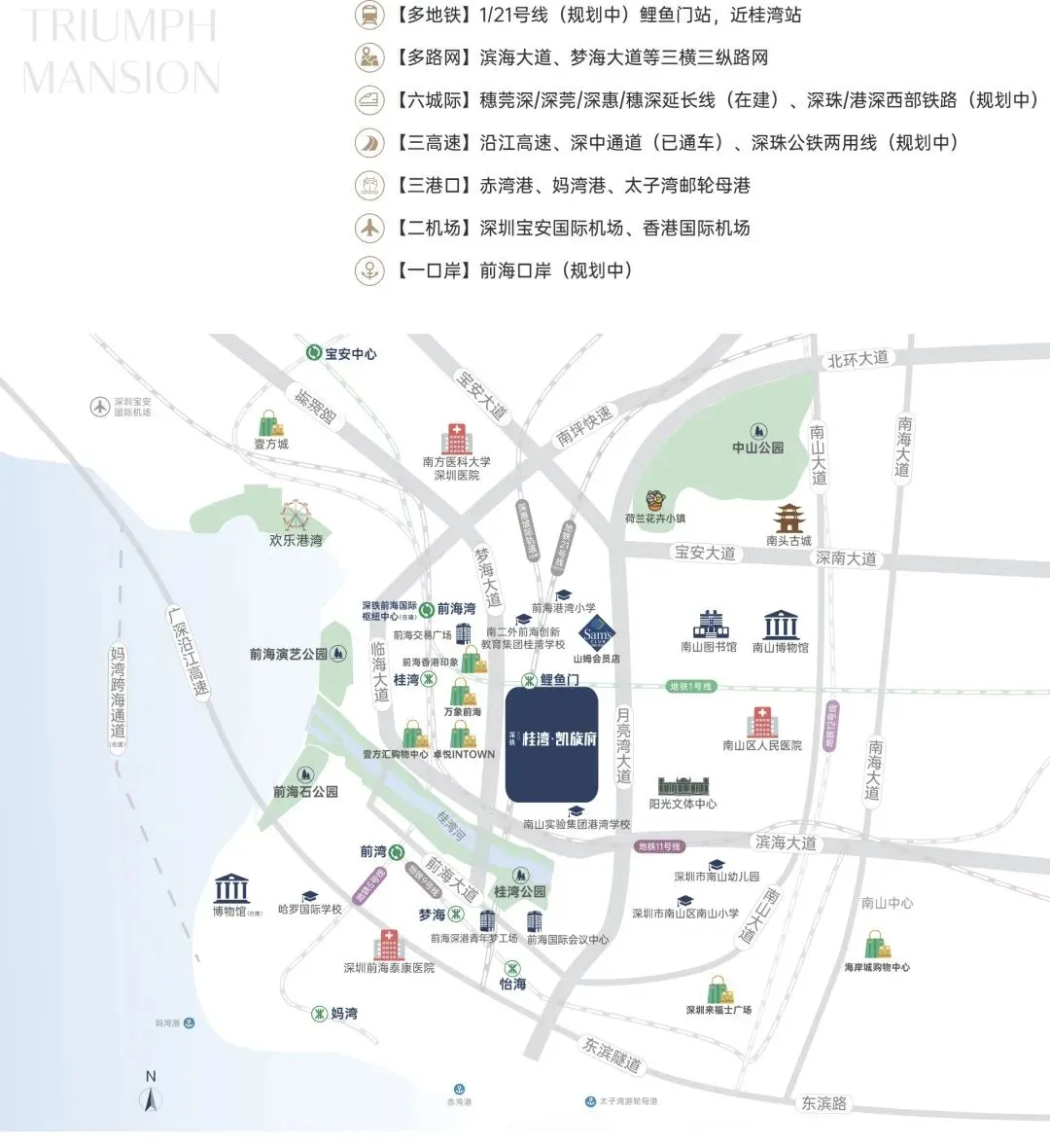 深铁桂湾·凯旋府距离地铁1号线鲤鱼门站步行距离约600-700米,为目前最近的已运营地铁站;片区内已运营地铁线路还包括5号线桂湾站、9号线梦海站、11号线前海湾站,各站点与项目直线距离均在1.5公里以内,需步行或搭乘短途公交换乘。自驾方面,项目周边主要城市道路为梦海大道、桂湾四路、滨海大道、月亮湾大道,可通过这些道路接入城市主干路网,前往南山、福田、宝安等区域。前海湾综合交通枢纽、深惠城际前海段为片区已规划及在建交通配套,目前尚未完全投入全线运营,片区地下车行联络道已建成部分路段,可实现片区内部部分道路连通,公交方面项目周边1公里范围内设有多个常规公交站点,线路主要服务前海片区内部及接驳周边地铁站、商圈,暂无跨区域快速公交专线。