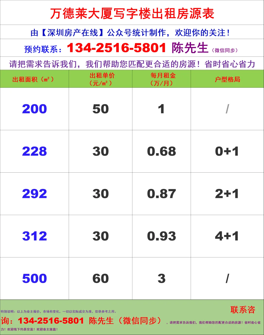 【深圳房产在线】陈经理写字楼租售团队:134-2516-5801(微信同步)