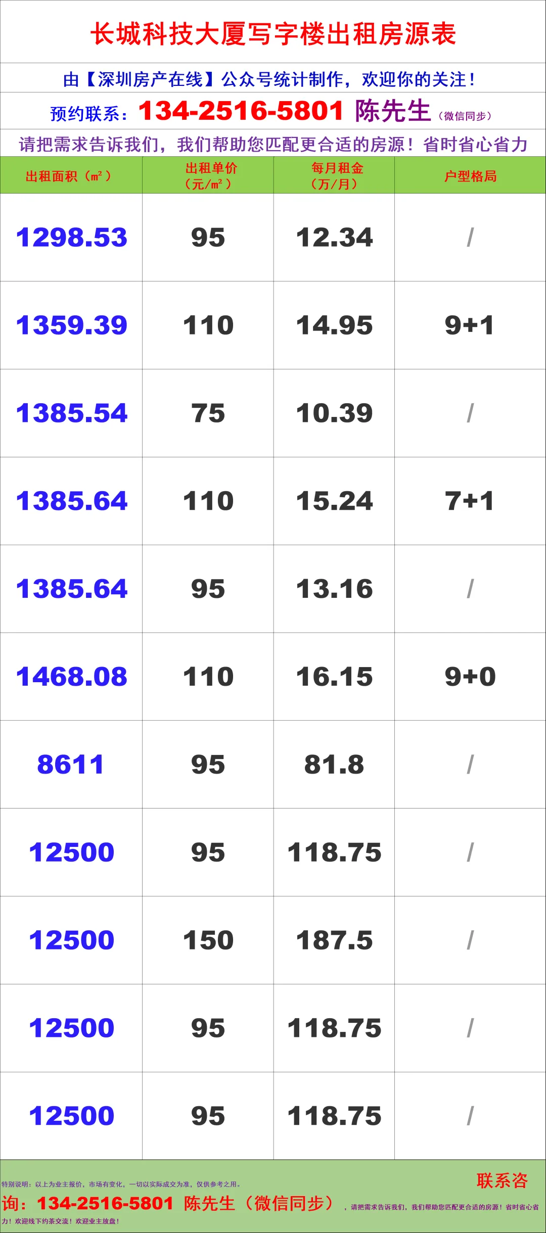 【深圳房产在线】陈经理写字楼租售团队:134-2516-5801(微信同步)