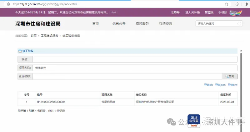 3月31日,深圳市住房和建设局官网显示该项目已经完成竣工验收备案。