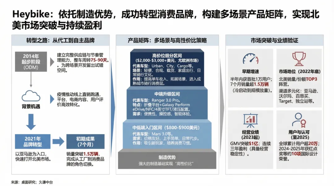 2022年至2023年,Heybike通过多元化渠道布局确立了经营稳定性。在稳固亚马逊地位的同时,品牌逐步铺开沃尔玛、百思买、Target及独立站渠道。2023年,品牌GMV突破1亿美元,并保持了连续三年的盈利状态,显示出在规模扩张之外极强的财务健康度。