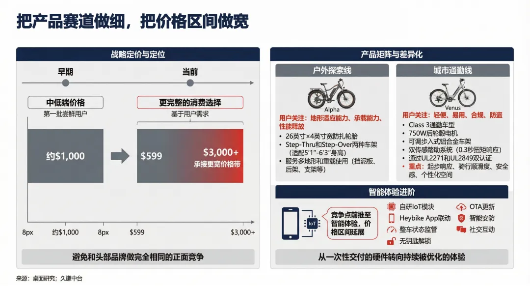 2021年进入北美市场后,Heybike凭借“高性价比”策略实现爆发式增长。借助亚马逊平台,其在7个月内卖出1.5万多辆,仅用一年时间便跻身北美电动自行车销量TOP3。在产品策略上,品牌初期主要通过800-900美元的价格区间切入以吸引新玩家,在快速培养消费习惯后,再通过多元化的产品矩阵拓展高价位场景,实现从大众化向成熟骑行消费层的覆盖。