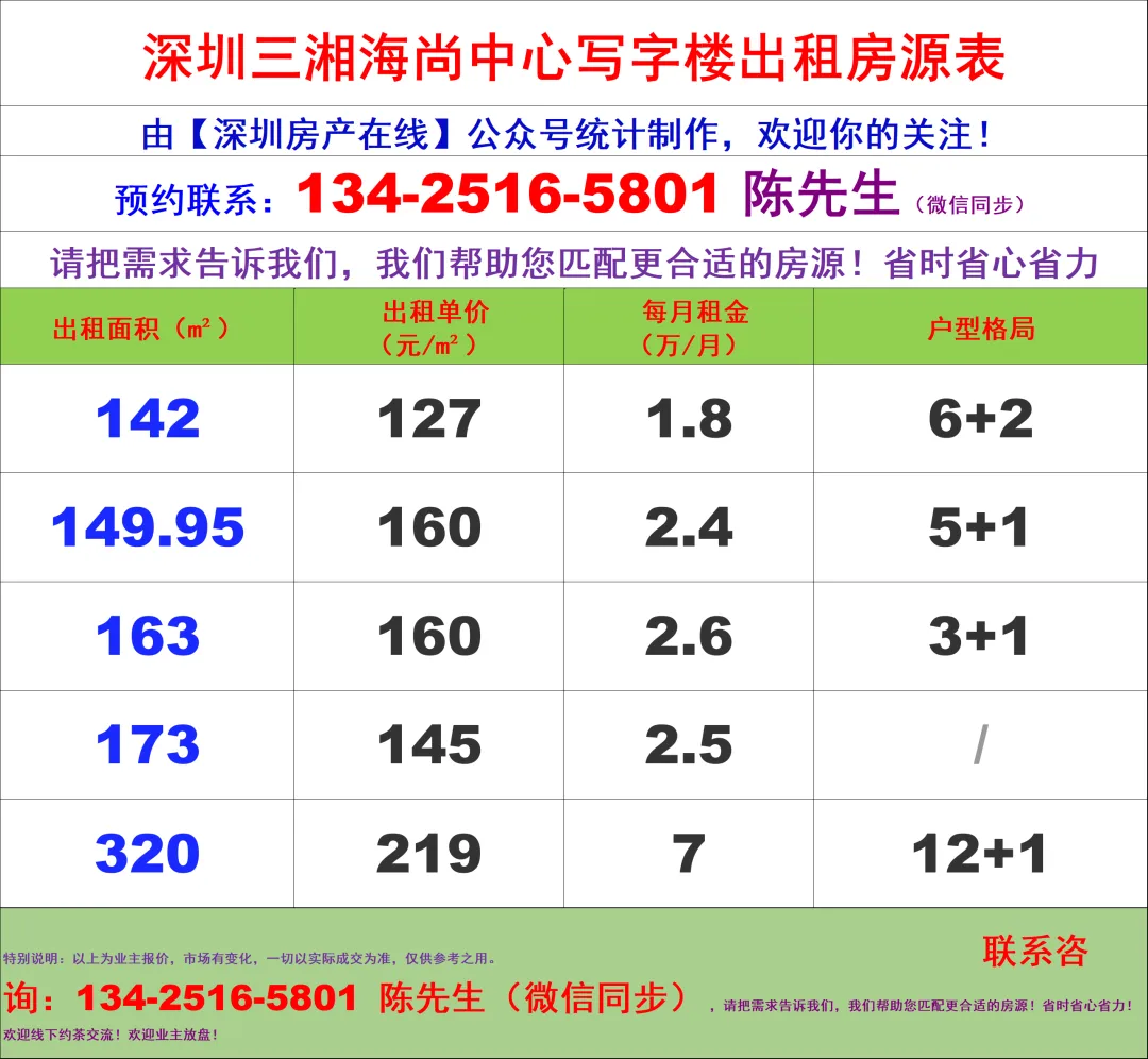 【深圳房产在线】陈经理写字楼租售团队:134-2516-5801(微信同步)