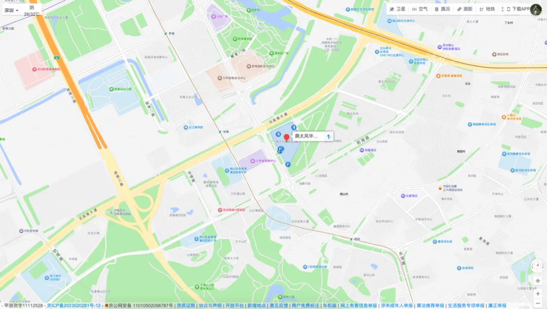 鼎太风华花园七期,属深圳市南山区的南山街道办管辖,位于南山区的月亮湾大道与东滨路交汇处;由深圳市鼎太风华投资有限公司在2003年开建,2025年开始陆续交楼,总占地面积约27000平方米,总户数约730套,地面停车位约580个,小区大容积率2.96,物业为深圳市万科物业服务有限公司。