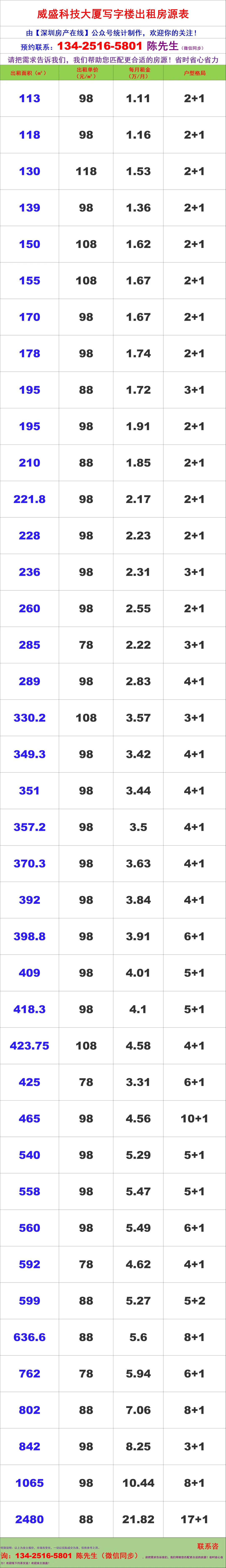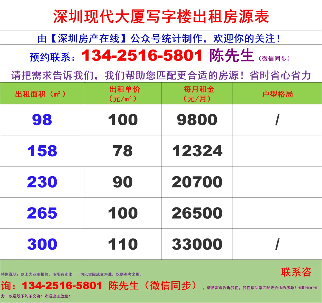 【深圳房产在线】陈经理写字楼租售团队:134-2516-5801(微信同步)