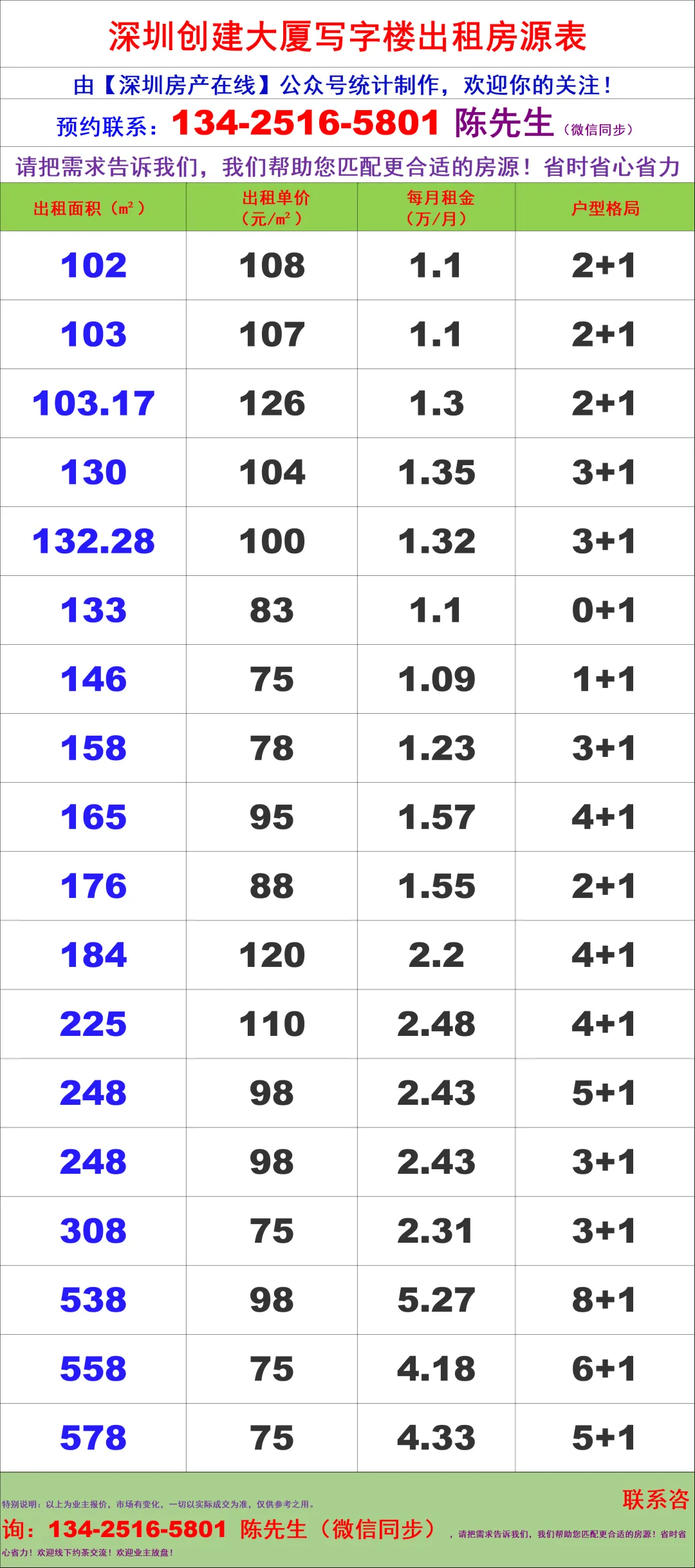 【深圳房产在线】陈经理写字楼租赁团队:134-2516-5801 (微信同步) 客户免佣 全程线下带看