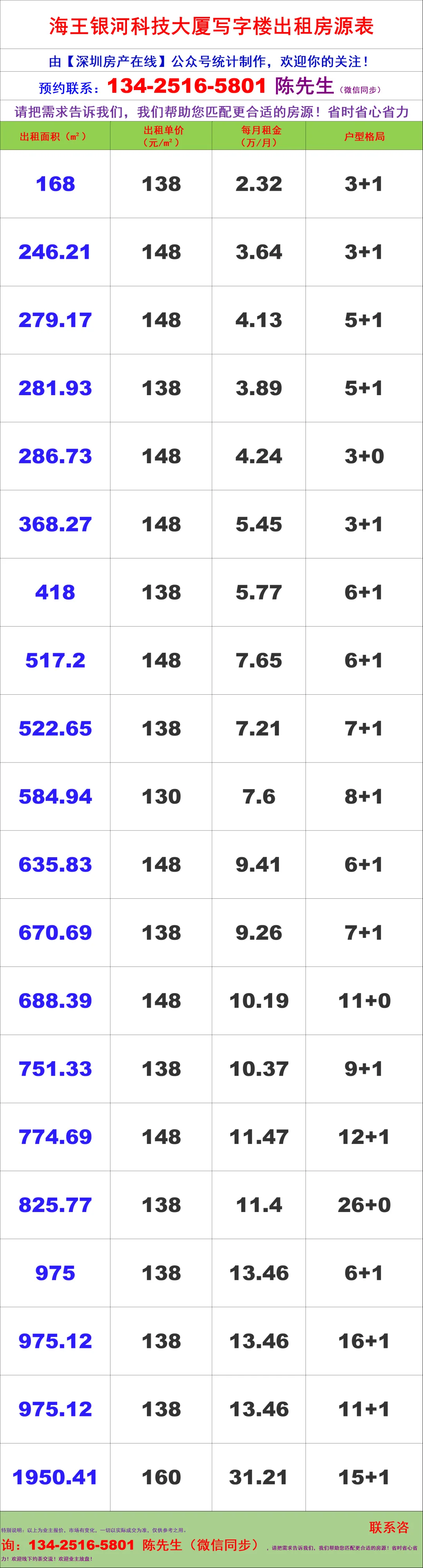 【深圳房产在线】陈经理写字楼租售团队:134-2516-5801(微信同步)