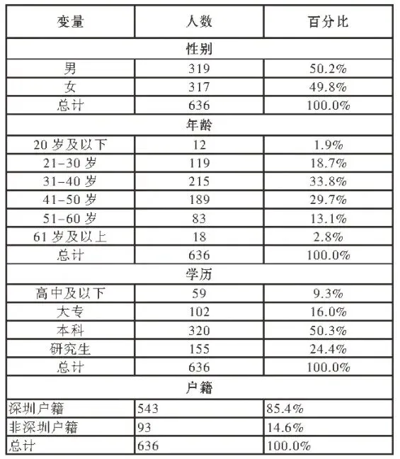 基于深圳现代化的指标体系,通过对三级指标的操作化,采用李克特量表设计调查问卷,受访者根据自身感知选择答案,答案设置为1—5分,分值越低,表示越不赞同或越不满意,分值越高,表示越赞同或越满意。在样本选择上,以行政区划进行分类抽样,通过网络调查和电话调查,总共获取有效答卷636份(见表2)。