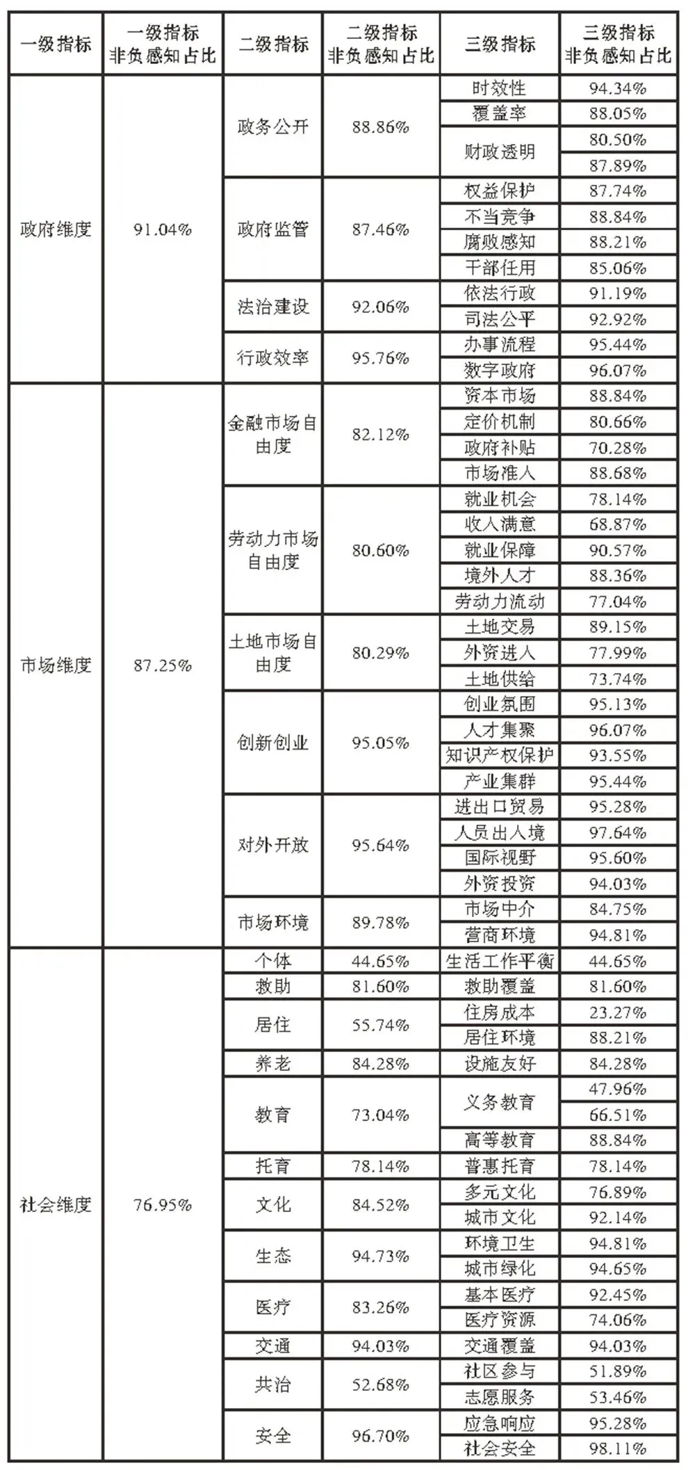 在52个三级指标中,政务公开的时效性、依法行政、司法公平、办事流程、数字政府、就业保障、创业氛围、人才集聚、知识产权保护、产业集群、进出口贸易、人员出入境、国际视野、外资投资、营商环境、城市文化、环境卫生、城市绿化、基本医疗、交通覆盖、应急响应、社会安全等22个指标均有上佳表现,而生活工作平衡(44.65%)、收入满意(68.87%)、住房成本(23.27%)、义务教育(57.24%)、社区参与(51.89%)、志愿服务(53.46%)等6个指标表现欠佳,与受访者的期待有距离。