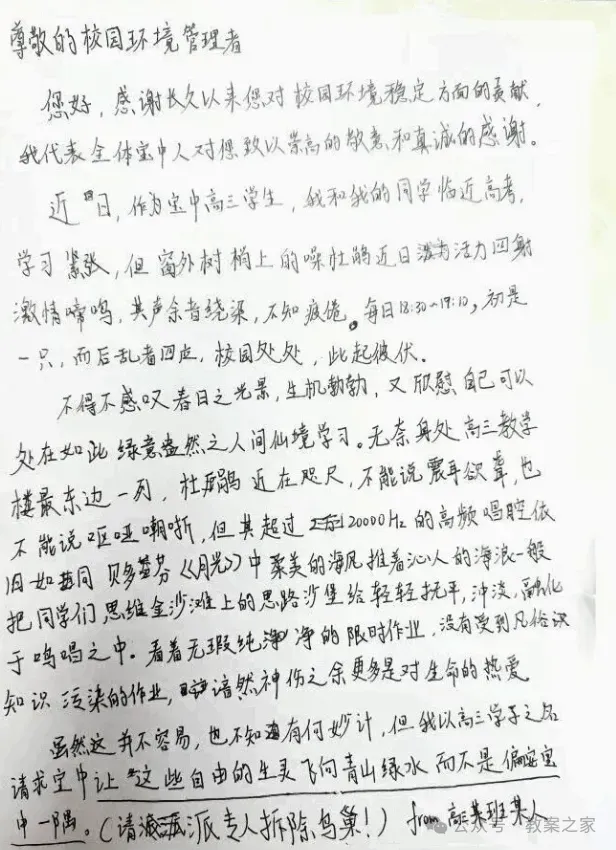 事情很简单:高三学生备考压力大,校园里的鸟儿叫声太吵,影响复习,有同学写信,希望学校拆掉鸟巢,换来一片安静。