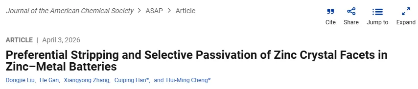 近日,深圳理工大学成会明/韩翠平教授课题组在国际顶尖学术期刊JACS发表题为“Preferential Stripping and Selective Passivation of Zinc Crystal Facets in Zinc–Metal Batteries”的研究论文。其中,深圳理工大学Liu dong-jie博士和中科院深圳先进院Gan he博士共同为论文第一作者,深圳理工大学成会明院士和韩翠平助理教授共同为文章通讯作者。