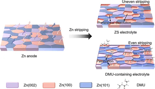 在这里,我们从晶体学的角度揭示了锌负极的优先生锌行为。初始剥离过程中锌晶面溶解顺序由其剥离能决定,顺序为 Zn(100) > Zn(101) > Zn(002)。其中,Zn(100)晶面首先溶解,导致锌剥离不均匀。