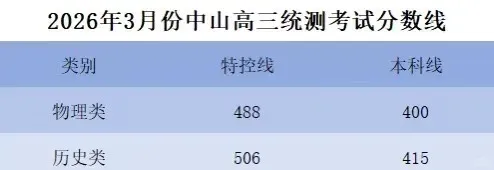 2026年中山一模物理类特控线488分,历史类特控线506分。