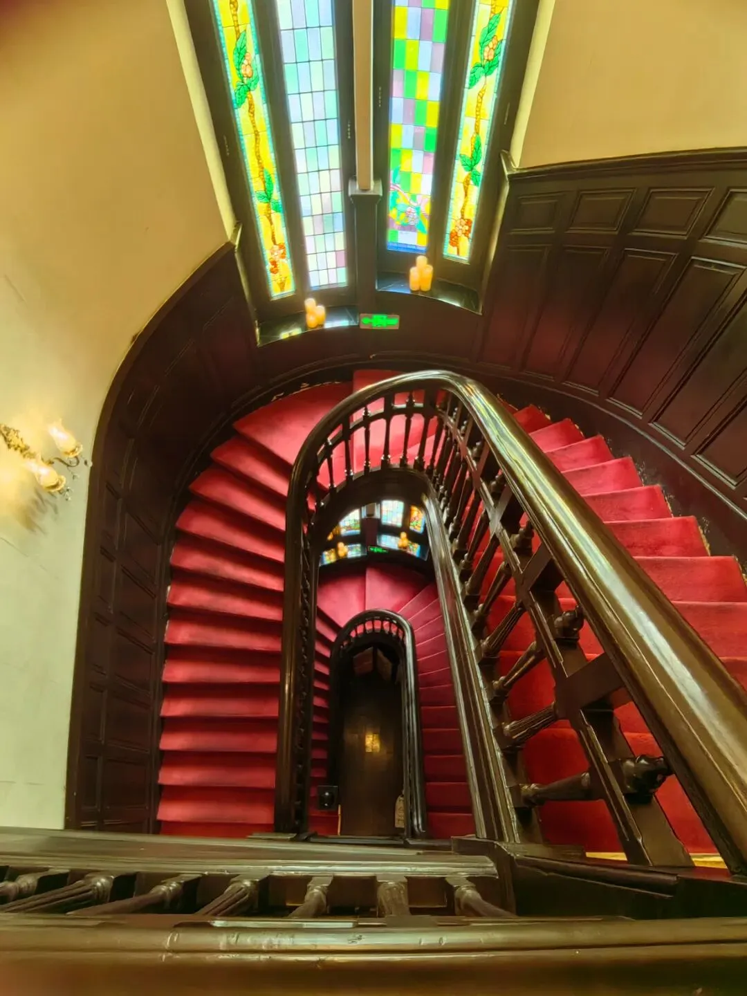 乌永哲董事长向我们介绍了建筑历史和特色。红瓦砖墙,颇有法国古典气息的立柱和窗台,彰显其典雅气派;色彩斑斓的琉璃,回旋直上的木质楼梯,每个细节处无不都在诉说着它的依稀过往,历史更赋予它无限的神秘和魅力。