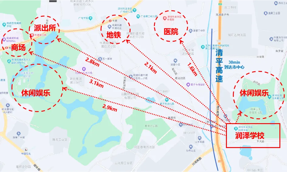 学校坐落于龙华观澜,毗邻观澜山水田园,环境宜人、交通便利,教学区、运动区、生活区规划科学。教学与康复设施齐全,普通教室配智能教学设备,设多功能专用教室及感觉统合、体育康复等专业康复用房;拥有室内体育馆、特色运动场地及图书阅览室等公共空间。学校为教职工配套宿舍与食堂,全方位解决生活后顾之忧。