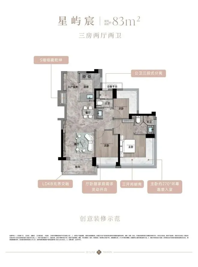 - 83㎡的3房2厅2卫,设计的是经典竖厅格局,客厅3.35米开间,LDKB一体化,S墙设计预留双开门冰箱卡槽位,三开间朝南,动静分区,分别做到了主卧16.02㎡/次卧9.08㎡/次卧7.01㎡(包含墙体飘窗),U型厨房,公卫三段式干湿分离,赠送1.98平设备平台,得房率约77.9%(不含赠送),套内面积64.28㎡,阳台5.02m²西南或东南朝向。亮点:83平做到了3房2卫,主卧270°无柱转角飘窗,厨房烟道外置+额外赠送设备平台,并且是纯南向格局。