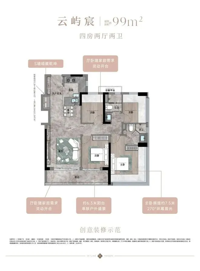 - 99㎡的4房2厅2卫,设计的是竖厅格局,客厅3.55米开间,LDKB一体化,S墙设计预留双开门冰箱卡槽位,三开间朝南,动静分区,分别做到了主卧15.26㎡/次卧9.57㎡/次卧6.96m²/次卧6.96㎡(包含墙体飘窗),U型厨房,公卫三段式干湿分离,赠送设备平台,得房率约79.5%(不含赠送),套内面积79.29㎡,客厅连接次卧出9.37m²大阳台西南或东南朝向。亮点:99平做到了4房2卫,主卧270°无柱转角飘窗,厨房烟道外置+额外赠送设备平台,并且是纯南向格局。