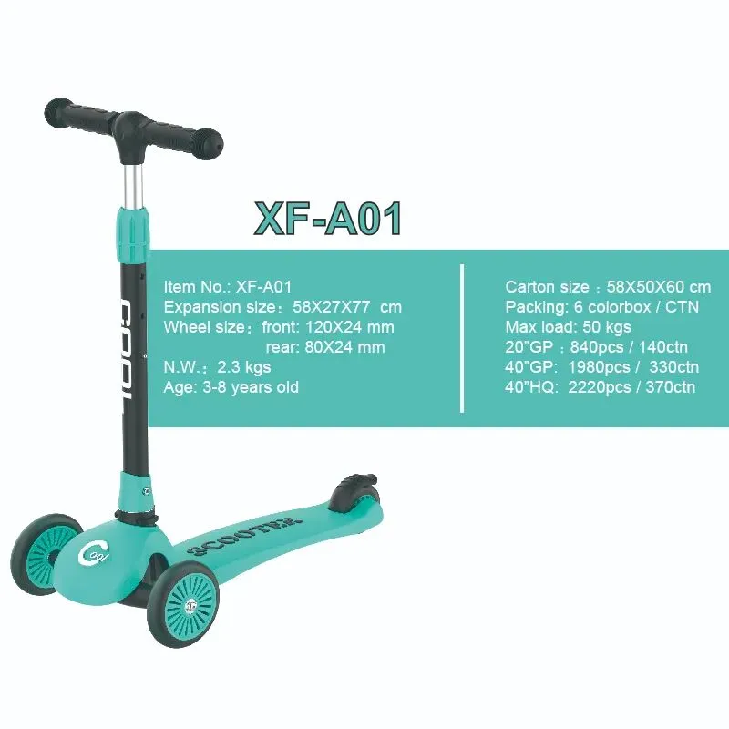 型号:XF-A01。展开尺寸:58*27*82CM (三档分别是71.5/76.5/82);轮子:前轮 ∮120*24, 后轮 ∮80*24"。 净重:2.2KG,最大承重:50KG。