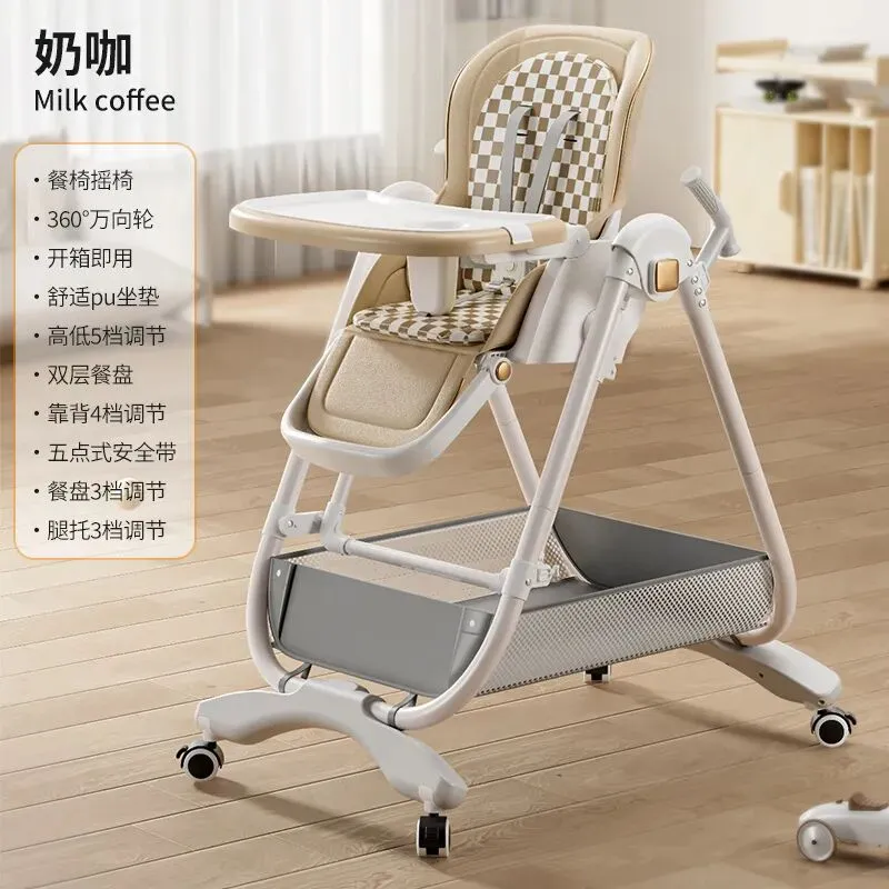 餐椅摇椅360°万向轮,开箱即用,舒适pu坐垫,高低5档调节,双层餐盘,靠背4档调节,五点式安全带,餐盘3档调节,腿托3档调节。