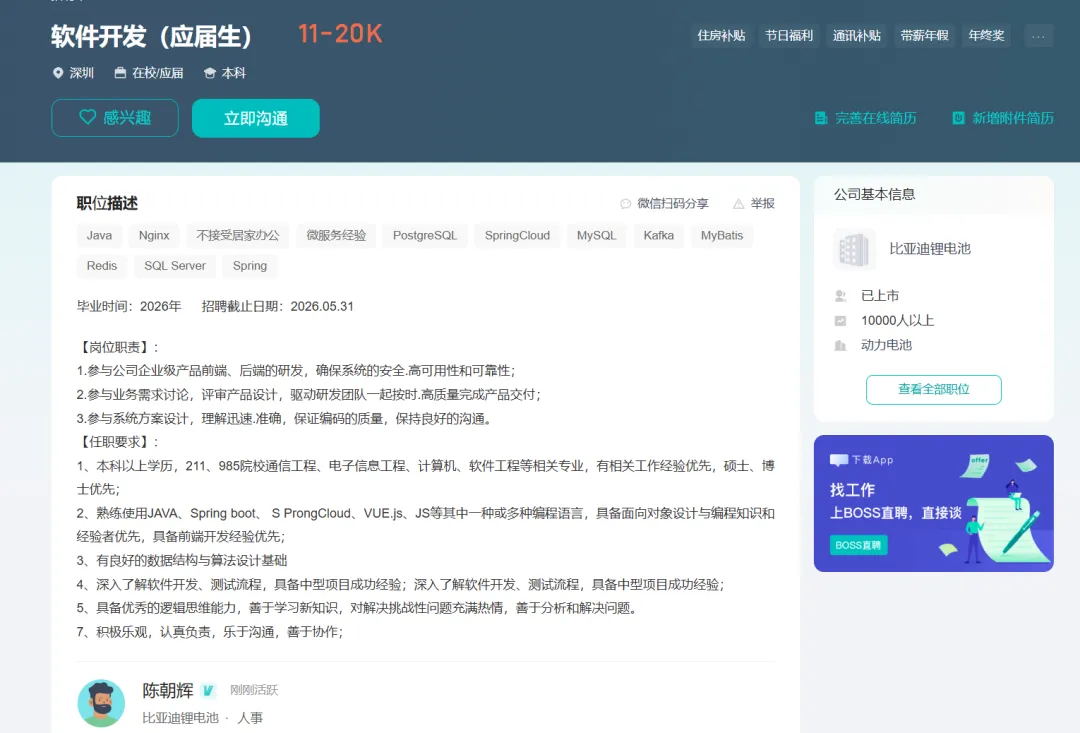 比亚迪锂电池招应届生软件开发岗位,11-20K,工作地址:深圳坪山区比亚迪坑梓一期综合楼,面向本科及以上学历在读毕业生