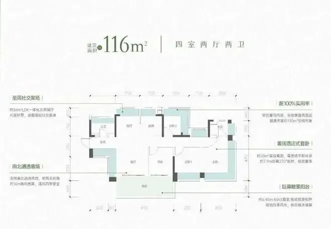 如果说约103㎡四房更注重功能;约116㎡四房的居住者或许更看重尺度和体验。家庭生活中要是不需要那么多房间,可以考虑把客厅和次卧打通形成开间约6.45米的大方厅,过道面积也不浪费。