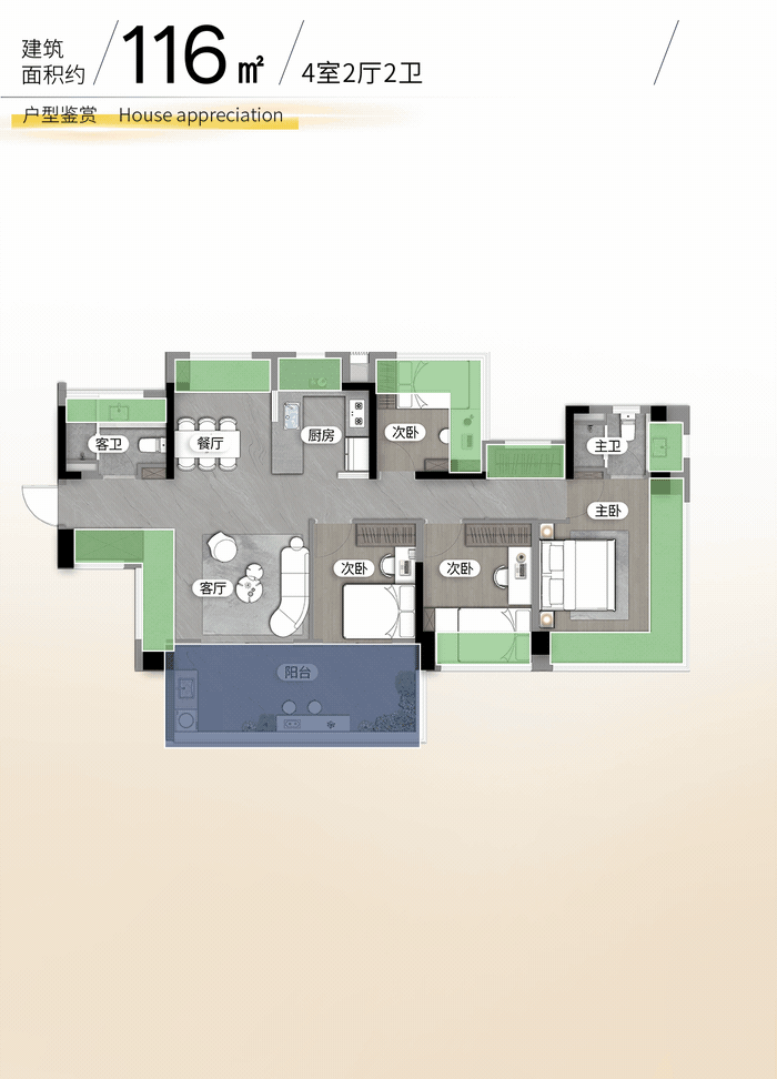 建面约116㎡四房,深圳当前低密住宅中南北通四房的门槛户型,适合对室内通风采光十分挑剔的家庭。