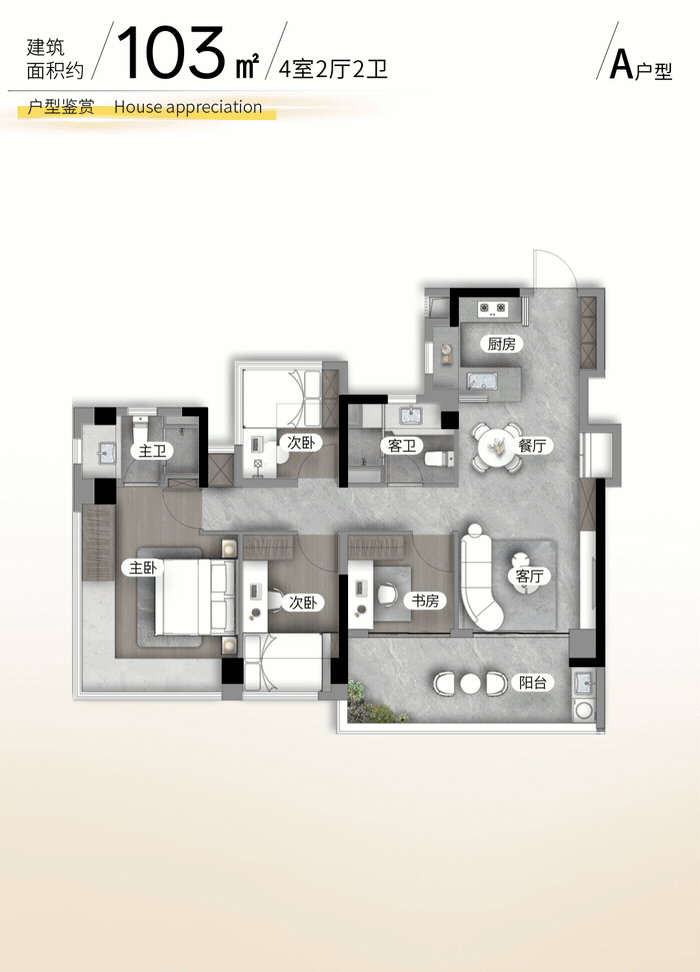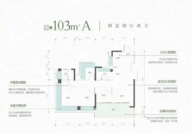 如果手头没那么宽裕又想入手四房,建面约103㎡四房是更具性价比的选择。