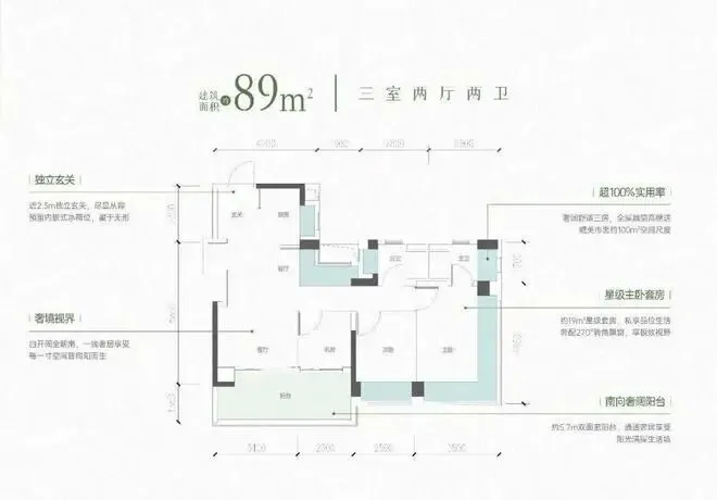 以A户型为例,南向采光约12.5米,三个房间和阳台都朝向小区园林,采光和视野都不错。主卧做了270°转角飘窗,双面采光,躺在床上就能看到窗外风景,居住体验的提升是实打实的。