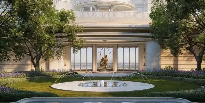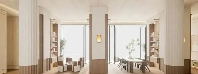 以玉兰花为设计元素,按顶奢酒店会客标准打造。局部层高约4m,搭配全景落地窗,南法园林尽收眼底。未来,可在此接待亲友、洽谈商务,无需预约酒店或茶室。很多沟通与合作,在这样的环境下水到渠成。这里是客厅,更是圈层的默契场。