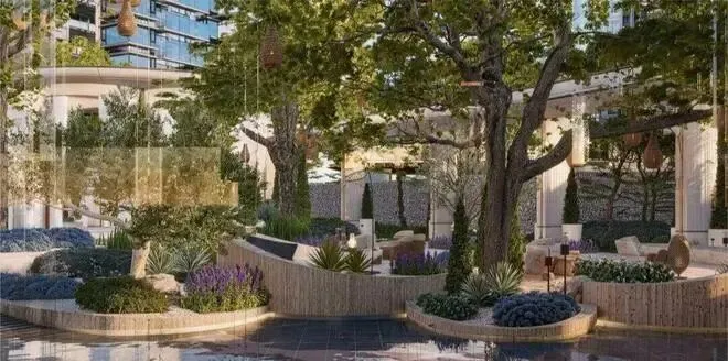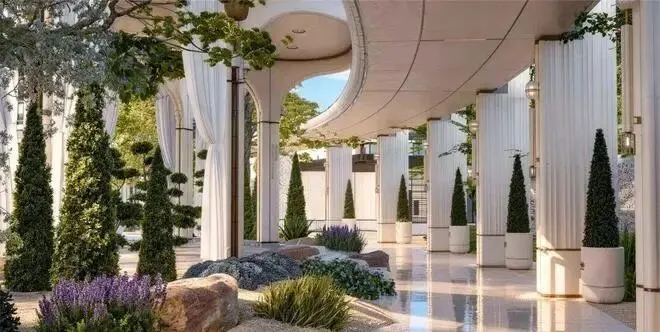 约75米风雨连廊,让业主回家不必淋雨或暴晒,两侧搭配错落有致的南法树种。每一棵树、每一个摆放位置,都经过反复推敲——不惜成本与心血。廊下是无边界社交场,廊外是南法花园。
