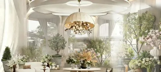 灵感源自法国尼斯老城与花市肌理,以轻盈纱幔与拱廊,模糊室内外边界。约4.8米奢阔挑高,通透敞亮。散步累了,随时坐下休息;邀闺蜜小聚,喝上一杯咖啡,心情自然愉悦。阳光洒落,手工插花,仿佛置身南法小镇的花房沙龙。