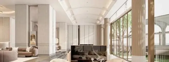 复刻法国香榭大道风情,以白马庄园秩序罗马柱为灵感,打造一方庄园会客厅。