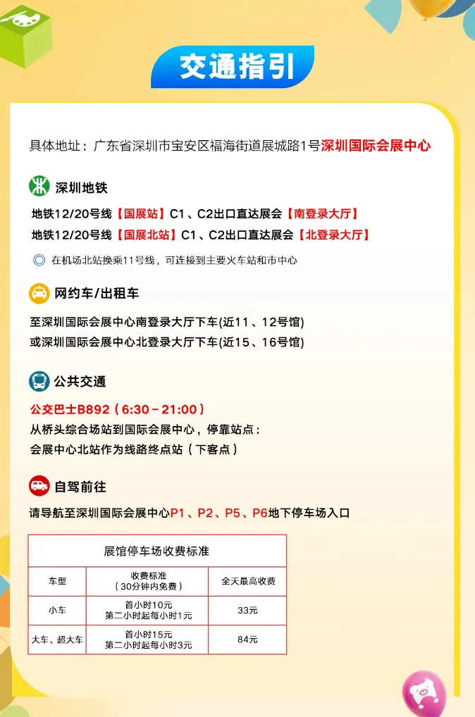 12号线/20号线国展站C1/C2口,国展北站D口,直达深圳国际会展中心。